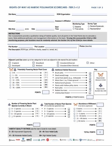 This scorecard is intended for use by most assessors, but some skill level is required to identify per cent plant cover, flowering plants in bloom, habitat resources, and manage threats and opportunities. Required monitoring fields for the Monarch CCAA and Bumble Bee CBA are now distinguished.